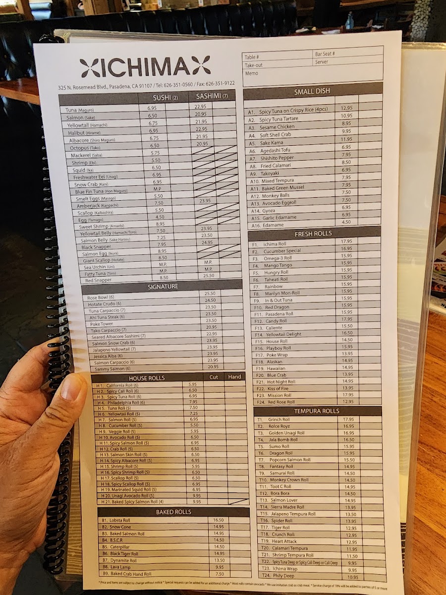 Located at 325 N Rosemead Blvd in Pasadena, CA, Ichima offers a delightful fusion of fresh, flavorful Japanese dishes, all crafted with the finest ingredients. Whether you're craving sushi, sashimi, or one of their signature rolls, the variety on the Ichima Menu guarantees something for everyone. The menu is filled with vibrant, carefully prepared options that cater to both traditional tastes and more adventurous palates. From savory appetizers like gyoza to flavorful entrées, each dish is designed to impress with its balanced flavors and artistic presentation. Whether you're dining in or taking out, Ichima invites you to indulge in a satisfying culinary experience with every bite.
