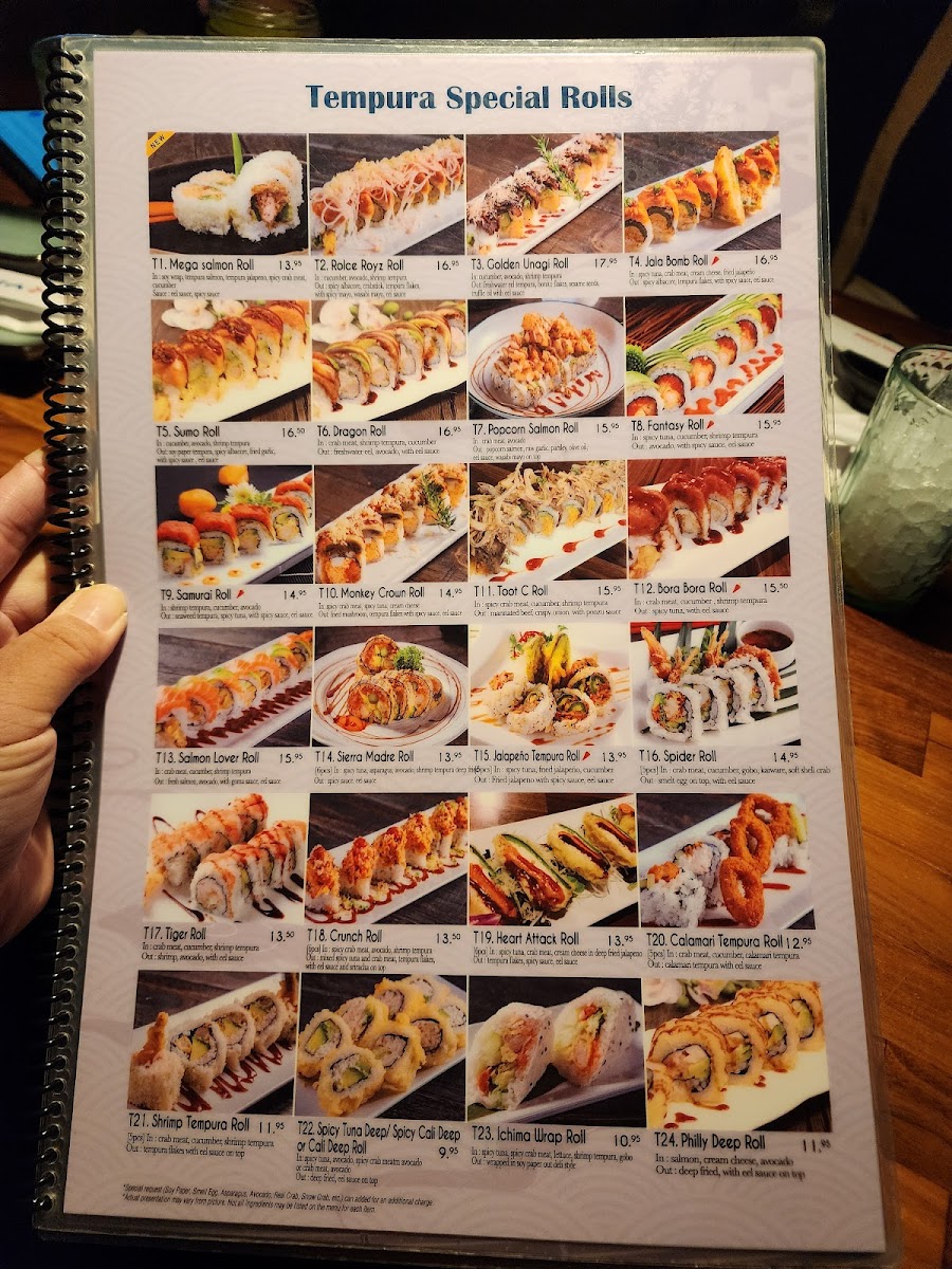 IN: Spicy tuna, Crabmeat, cream cheese, fried jalapeno. OUT: Spicy albacore, tempura flakes, with sauce.